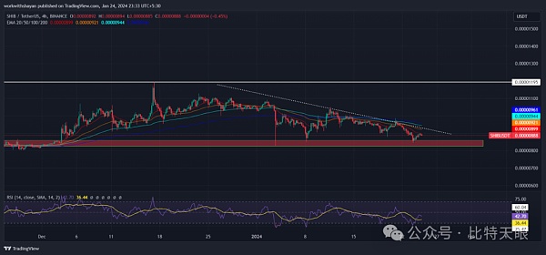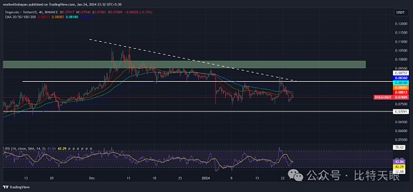 20日均线趋势稳定,相对强弱指数(RSI)接近中线44水平,表明走势平衡。如果价格突破下降阻力线,我们可能会看到价格飙升至0.095美元。
