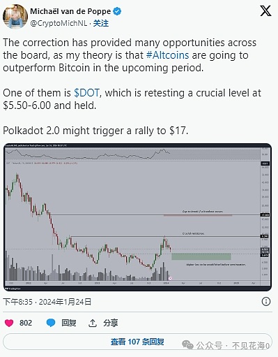 著名加密货币分析师 Michaël van de Poppe 表示,在过去两个月买家帮助确保了 5.50 美元至 6.00 美元的支撑区间后,DOT 价格很快就会上涨至 17 美元。短期 DOT 的看涨前景受到 50 周移动平均线 (MA) 的支撑,该移动平均线自去年 12 月中旬以来一直充当支撑位。
