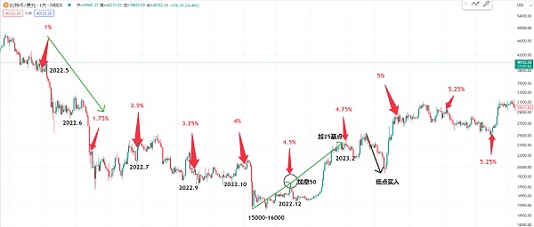 或者是到了2022年的9月份 美联储的利率是继续加了75个基点 然后到了2022年的10月份 利率也是继续加了75个基点 然后我们可以看一下比特币在15000到16000的底部 就是这个高点的位置当天美联储释放了一个非常大的利好 就是加息从75个基点降到了50个基点