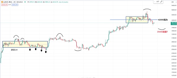 所以我也是在思考目前的这个位置有可能还是会上涨 当然上面的一个压力区是在42000附近 如果突破了这个压力区 我就会平掉我的中长线空单