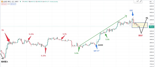 因为早就内部已经计划好 要怎么拉盘或者是下跌 那就比如这一次上涨 我们看空间就可以了 涨到高点的位置之后 ETF登录了美国的市场 那在低点的位置就一直有预期美国的ETF要上市