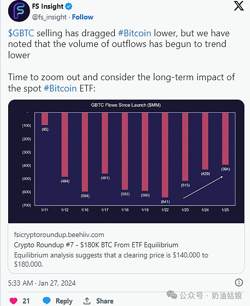 彭博社分析师 James Seyffart 指出,这是 GBTC 自交易第一天以来流出量最低的一天。周五(第 11 天),GBTC 流出量达到 2.551 亿美元,使该基金的累计流出量达到约 50 亿美元。