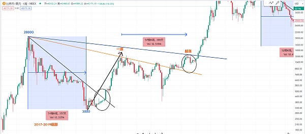 或者我们可以看一下比特币在2017年到2019年的底部 也是一样 从大约20000的高点到这个低点的位置 周线里面也是走了51根K线 那3000美元就是比特币的底部