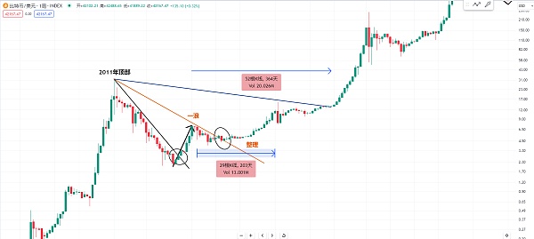 而且我们可以再观察一下比特币在2012年的底部 这边突破第一浪上去之后 后面我们可以看到在这边整理了两百多天又有一个突破 就是这个高点跟他前面在2011年这个顶部的高点连起来的一条蓝色的线