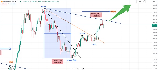 我们可以从31000的高点拉一个370天左右 大约是在4月中旬 有可能比特币会不会突破这个49000的压力 然后一直突破更高的历史高位