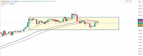 我们先来看一下比特币周线的这张图表 我记得去年在25000附近也是再次通知大家 有可能比特币要大涨 那从25000到这次49000的高点利润也是接近了100% 或者是我们待会再看一下比特币的周线