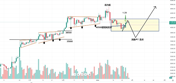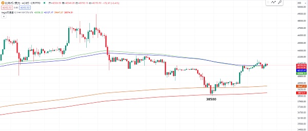 那如果下一步我们短线观察一下 超短线的一个支撑就是这一根K线一半的位置 大约是在40500附近 大家也可以当做超短线的一个支撑 或者是万一他这个位置再跌破的话 那我们就要观察除了这个支撑之外 还有没有更低的支撑