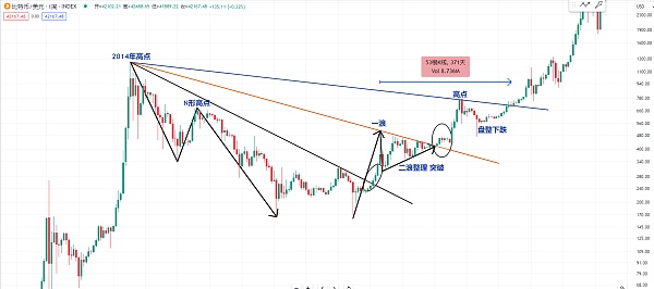 当时在这个位置突破 后面在这个位置有一个盘整或者是下跌 或者我们可以观察一下这个高点跟当时比特币在2014年的这个顶部高点连起来的一条线也是比特币在突破高点之前在这个区间的时间 我们从比特币的第一浪开始计算 他盘整的时间到突破这条蓝色的线里面的时间是371天