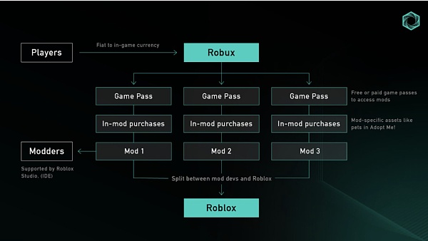 在这些游戏中,出现了一个新的「玩家」类别:modders(模组制作者),他们积极为不断增长的 mod 库和生态系统做出贡献。在 Roblox 中,modders 可以通过游戏通行证和 / 或游戏内购买以 Robux 的形式获得他们的内容的收益。通过构建和运营成功的 mod 所获得的回报可以与独立开发游戏的回报相媲美。以 Adopt Me!为代表的独立工作室 Uplift Games 每年雇佣约 40 人,收入达 6000 万美元。