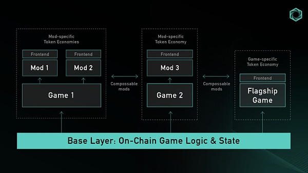 例如,将游戏内资产作为 NFT 进行化身,并结合智能合约实施可执行的社交契约。同时,其余的组件可以在离链上运行,包括一个通过适当的框架重设计的 modding 生态系统,以确保可组合性。