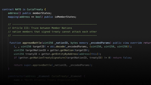 条约有很多含义。它可以是一项类似于北约的协议,在加入并支付会费后,你被禁止攻击其他委员会成员。它可以是一个发行以 USDC 支持的代币的国家银行,迫使签署协议的交易伙伴在下次在游戏内 AMM 中交换时严格使用你的国家货币。——Curio 的 Kevin Z