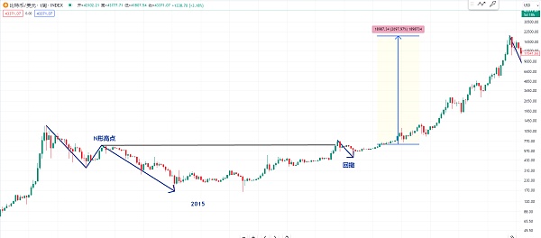 或者我们可以观察一下比特币在2015年 也就是产量减半之前突破了2013年到2014年熊市的这个N形高点 突破了之后他后面是有一个回撤 然后从这个位置开始计算 他后面是上涨了将近30倍 .