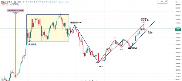 们回到比特币周线的图表 也就是这个N形高点目前的48000是已经达到了 那之前我也是有讲过