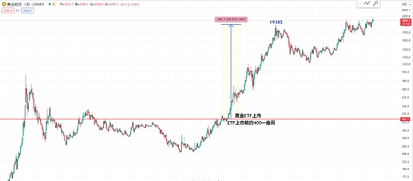我们可以看一下黄金现货ETF在历史上 当时价格是在400一盎司左右 他现货ETF上市之后 后面是涨到了2011年的高点 这个位置价格大约是在接近2000美元一盎司左右 所以空间涨幅是接近4倍
