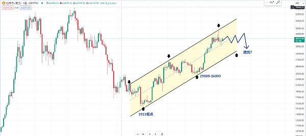 然后我们再来看一下比特币周线的这个上升通道 我们看一下比特币在2022年的两个低点 连起来就可以形成一个上升的趋势线 25000到26000的位置也是同样两个低点在这个位置是一个买点
