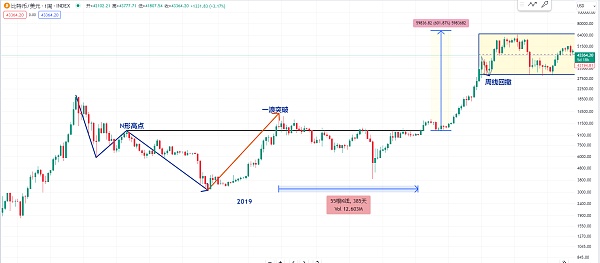 我们可以观察一下比特币在2017年到2018年的熊市 当时在这个位置N形高点 他在第一浪里面突破 后面是盘整了接近了一年的时间 从这个N形的高点开始计算 后面突破 他这个位置价格涨了是接近了600%