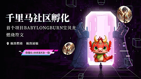Babylongburn宝贝龙是由千里马社区孵化第一个项目,助力千里马社区全球化、市场化、全面化。2024年是中国龙年,这是一个巨大的热点IP,再加上Babylongburn宝贝龙独有的燃烧机制:1%自动燃烧底池代币黑洞销毁,每个小时燃烧0.5%,一天燃烧12%。会使币量越来越稀少,后期升值空间巨大!