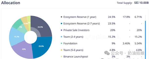 Sui 的总供应量为 100 亿枚, 48% 为生态系统储备、 20% 私人投资者、 20% 团队、 9% 基金会、币安 Launchpool 占 3% 。当前流通主要为生态系统,基金会与 Launchpool,流通率为 11% 。