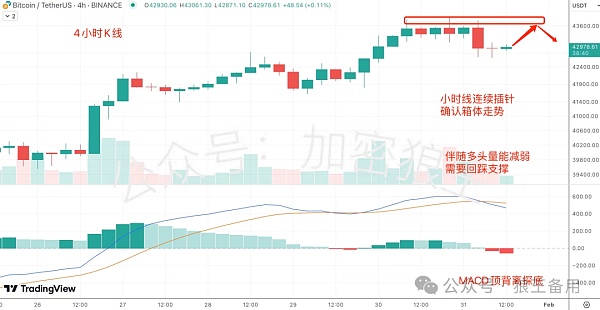 这两天灰度持续向Coinbase转入BTC,对BTC起到抛压预期作用,BTC沿5日线走高,仍处于反弹行情,小时线连续插针,确认箱体阻力,上方43288美元是箱体关键点,BTC放量突破43288美元,才能快速拉升,进入新一轮多头上冲走势,接下来BTC在43288美元触顶回落。