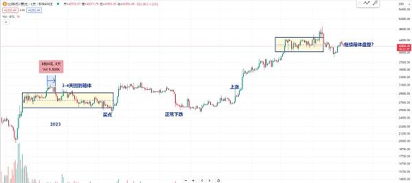 既然目前判断还是有可能在箱体盘整 那我们就要尽量参考2023年日线里面的比特币 当时在4月份或者是后面的8月份崩盘的低点 我们可以观察一下就是目前的这个盘整区间跟去年的盘整区间是非常的相似