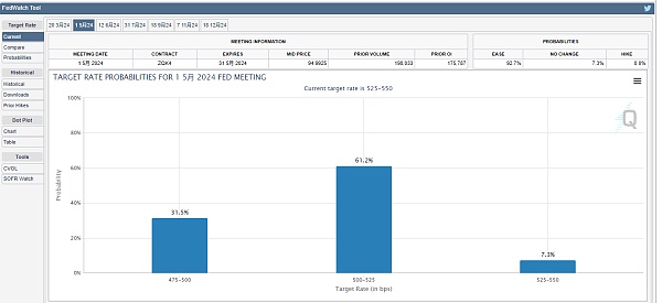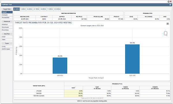 我们先来看一下美联储的利率决议 因为昨天晚上美联储是没有继续加息 不过我们可以看一下3月份的这个利率决议 后面不排除有可能会降息 特别是三月份有没有可能会降息35个基点 目前的概率是34%