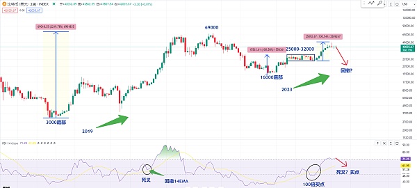 然后我们再来看一下比特币2周级别的图表 特别是100倍继续买入的机会我们要怎么去寻找 我们先来观察一下比特币的价格 在两周图表里面他的空间是涨了这么多 当然对于长线而言 他的上涨并不算多 只是短线有可能涨多了也是担心这个位置会不会有回撤 就是担心这个rsi指标会不会有死叉