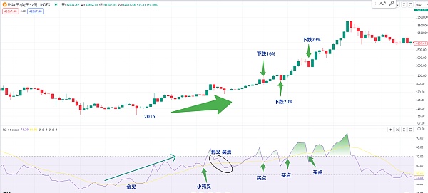 我们可以参考目前比特币的牛市他是非常像2015年到2017年的牛市 那我们观察一下2015年的rsi指标 他在这个位置底部起来之后是一路都在黄金交叉 或者是在这个位置也是有一个非常小的死叉 就是很重要100倍做多的买点
