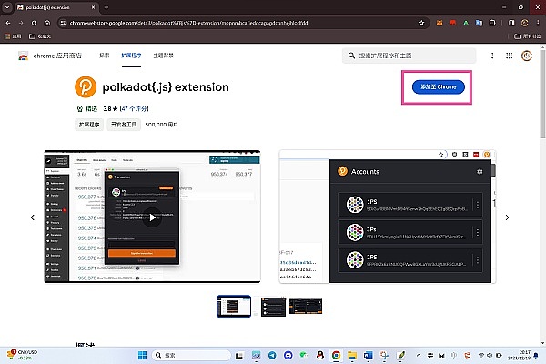 打开网址:https://chromewebstore.google.com/detail/polkadot%7Bjs%7D-extension/mopnmbcafieddcagagdcbnhejhlodfdd,如下图: