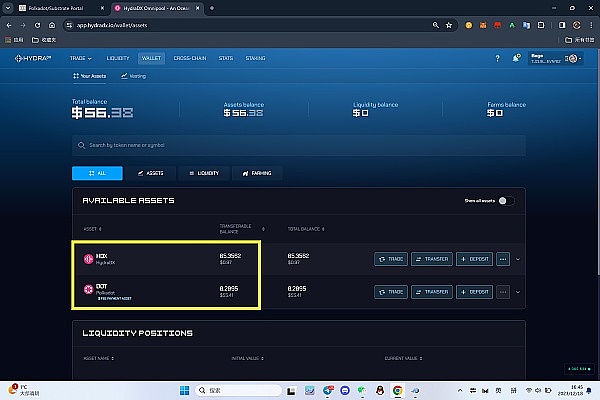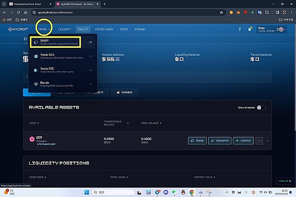 要想在 HydraDX Omnipool(万能池)交易,需先将 DOT 从 Polkadot 链跨转到 HdyraDX 链。