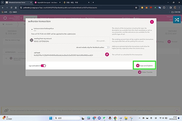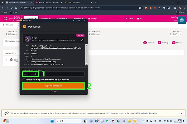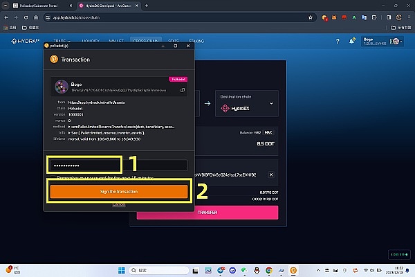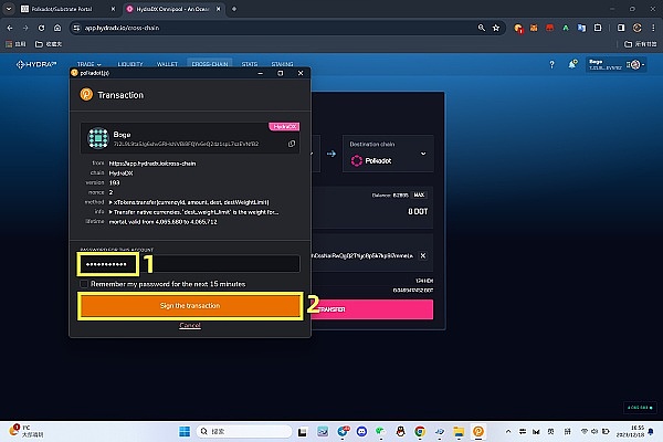 1 处输入密码,2 处点击按钮 Sign the transaction(签署交易),完成跨链。