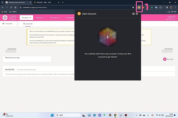 打开谷歌浏览器,点击 1 处的波卡钱包扩展程序,出来个小弹窗: