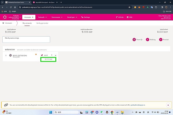 在浏览器地址栏输入 https://polkadot.js.org/apps/#/accounts,查看跨转回 Polkadot 链上的 DOT 数量(如果钱包网显示的不是 Polkadot 网络,重复 二1 步骤):