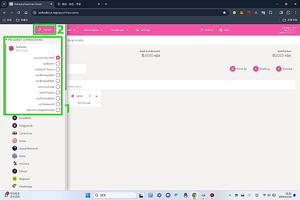 在下拉栏 1 位置,找到 Polkadot 并点击它,然后点击 2 处 Switch(切换):