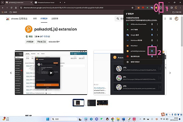 点击 1 处的按钮,在弹窗点击 2 处的小图钉,把它变成实心。看!右上角椭圆框住的那个黄底白字的变形 P. 就是波卡钱包扩展程序!