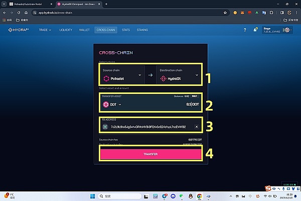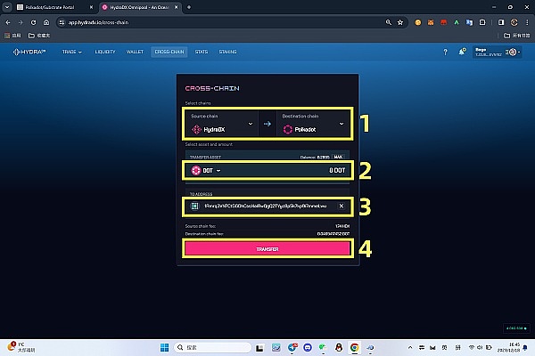 1 处选择来源链和目标链:左选 HydraDX,右选 Polkadot;