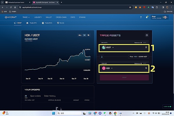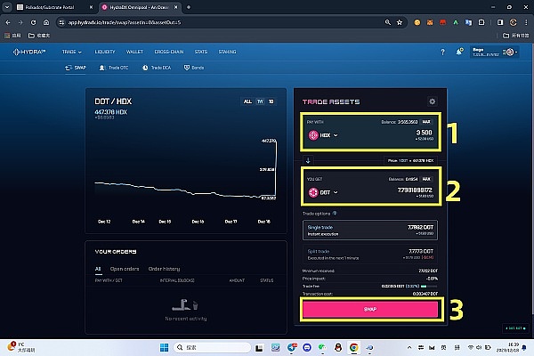 1 处选 HDX 并输入数量:3500;2 处选 DOT,数量自动出现。点击 3 处的按钮 SWAP(互换):