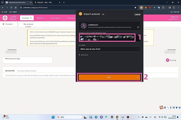 在 1 处准确填入助记词,点击 Next(下一步),后面的步骤和前面类似,波哥就不啰嗦了。