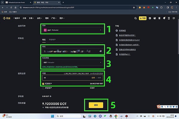 1 处选择币种 DOT,2 处将保存在写字本上的 Polkadot 账户地址复制后粘贴在这里,3 处币安会自动识别出了对应的网络(波哥建议还是要亲自检查一下网络是否正确),4 处输入要转出的数量(10 DOT),最后点击 5 处的 提现: