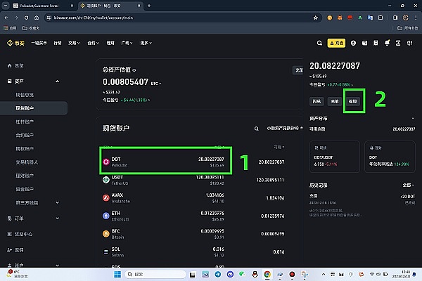1 处显示,波哥的币安钱包现货 DOT 的余额为 20.08。点击 2 处 提现: