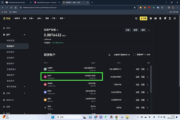 币安里的现货 DOT 余额为 18.08,与原始余额比较接近,表明已经到账(具体可查转账记录)。