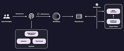 Pyth是一个去中心化的Oracle系统,提供多种类型资产的数据源,如加密货币、大宗商品、外汇、股票和ETF。他们的应用链Pythnet通过从多个数据提供商接收定价数据,并将这些信息聚合到单一区块链上,通过预言机,定义资产的“真实”或共同接受的价值。这些数据由Wormhole网络验证,该网络向定价服务签署一条消息以进行链下访问。价格数据然后被无需许可地推送到Pyth合约上,并被协议用于定义资产的价格。Pyth预言机不会自行在目标链上发布数据 - 相反,它使任何人都能在需要或请求时将任何价格随时带到链上,使应用程序可以根据自定义参数、需求和期望决定和调整价格更新的频率(称为“心跳”)。大多数协议使用5到60分钟之间的心跳,但可以在需要时随时向Pyth请求新的价格更新。Pyth的数据系统概述如下: