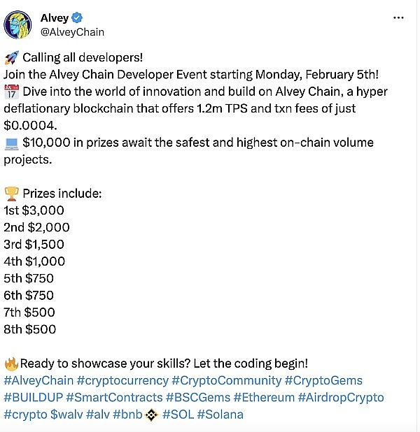 近日,AlveyChain项目发布新了链上生态活动,招募开发者来链上开发建设自己的项目,赢取1万刀奖励,欢迎各方开发者来体验AlveyChain超高的TPS以及极低的Gas费用。