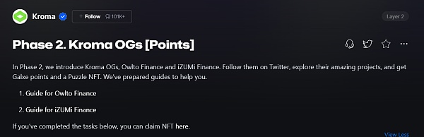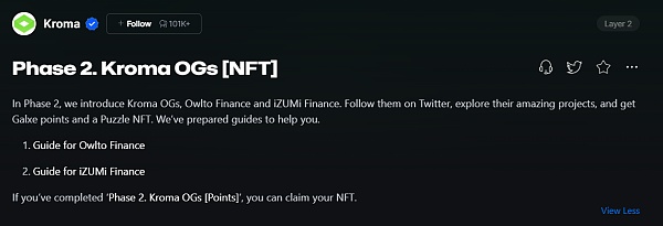第二期 - Kroma OGs [NFT]:同样从2023年12月4日开始,一直持续到2024年1月29日,该活动已经吸引了超过20,000名用户的参与。