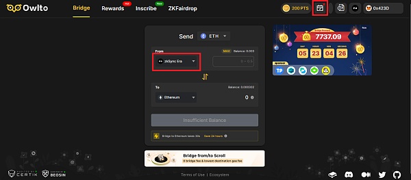点击日历图标开始每日签到Visit the Owlto Website (https://owlto.finance)