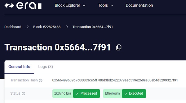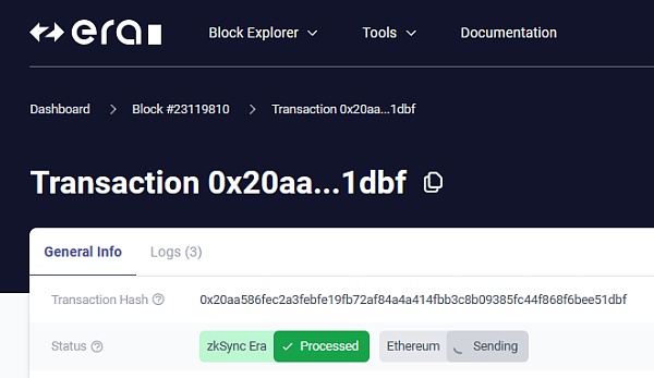 在Zksync区块链浏览器上验证: 在Zksync区块链浏览器上确认签到的状态。如果所有状态都变为“已处理”,则签到已完成。