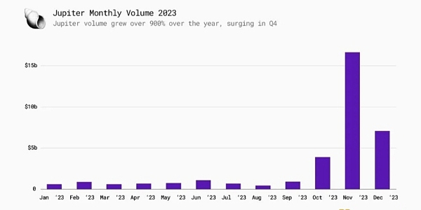 作为近期的热门项目,Jupiter在2023年月交易量增长约十倍,从1月的6.5亿美元增长到12月的71亿美元。而今年该项目日交易量更是多次超过Uniswap V3,并且早先也获得过500美元的项目融资。