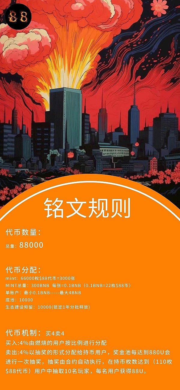 卖出:4%以抽奖的形式分配给持币用户,奖金池每达到880U会进行一次抽奖,抽奖由合约自动执行,在持币枚数达到(110枚$88代币)用户中抽取10名玩家,每名用户获得88U。