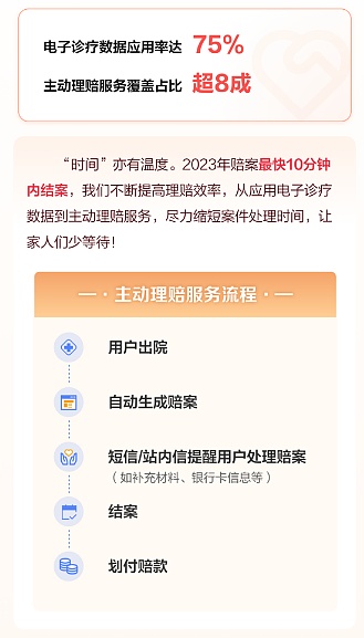 科技赋能提升理赔便利性,通过与大数据中心、医保中心、中银保信等多方联动,通过医保数据社会化应用,做到“让数据多跑路,民众少跑腿”,实现全程无纸化理赔,理赔电子诊疗数据应用率75%,一次性提交资料完成理赔的案件占93%。“时间”亦有温度,“沪惠保”平均结案时长2.3个工作日,最快仅10分钟内就完成结案,流程便捷、核赔高效,居于行业领先水平。