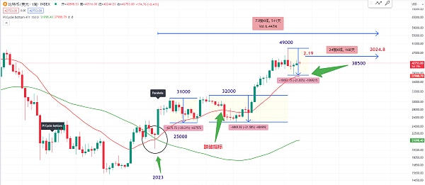 所以目前我们可以观察一下 前面的这个位置是已经跌破了Pi Cycle指标 那上一次跌到38500的这个位置Pi Cycle指标是没有被跌破 那我也是在思考 这个位置既然市场环境这么好的情况下