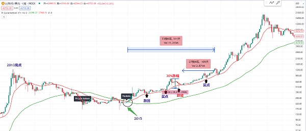 那中间的这个下跌 这一次会有这种下跌吗 我们可以观察一下比特币在2015年到2017年的上涨 有几次跌回这个Pi Cycle指标红色的这条线 那后面的这些位置都是买点 我们可以看到好多买点的位置都不会跌破Pi Cycle指标红色线 只有这个位置有一个下跌穿过了这个Pi Cycle指标